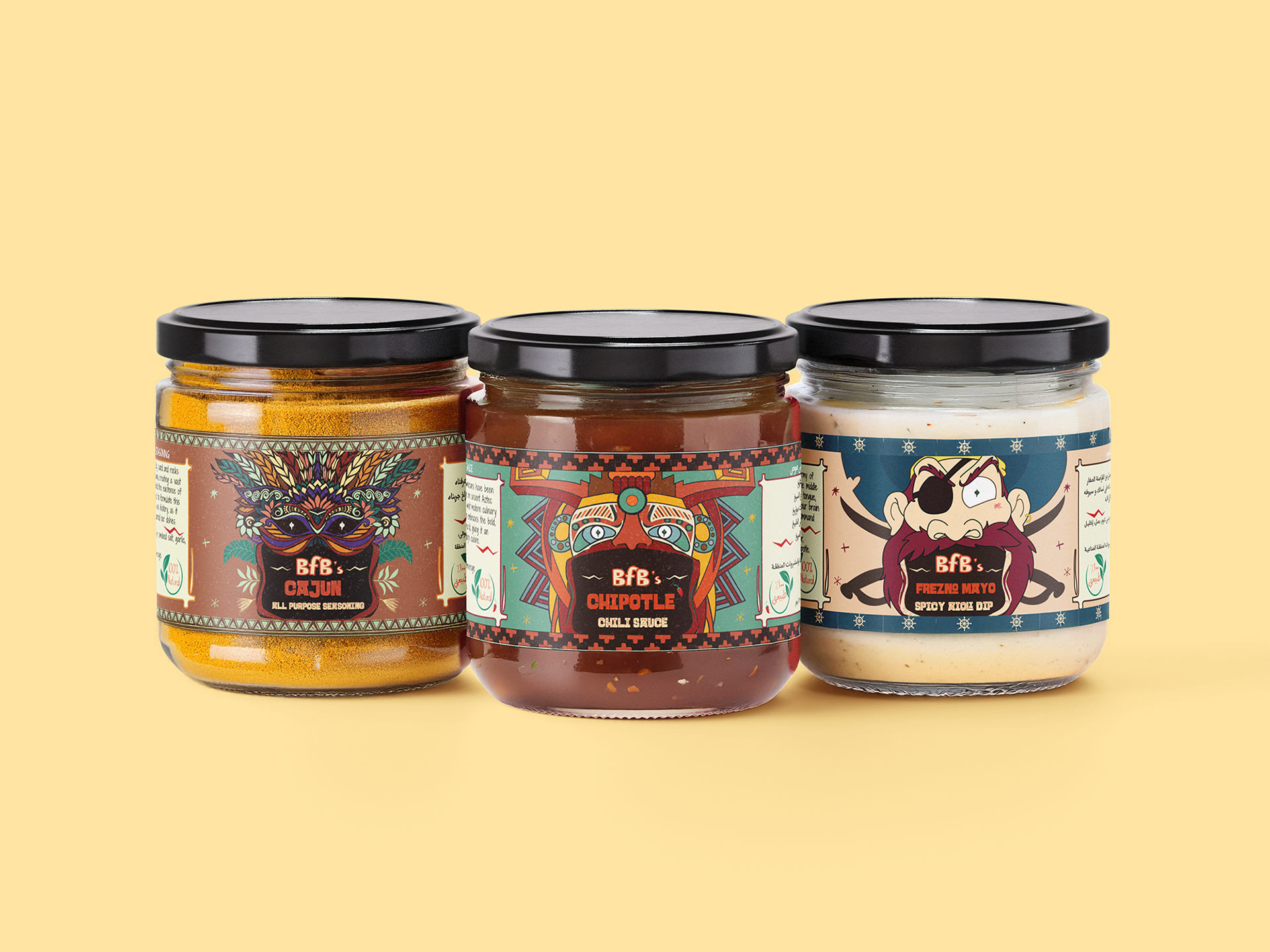 A packaging system designed for BfB’s line of dipping sauces and spices, where every jar tells a story. Each flavor is rooted in its cultural origin and paired with a custom character illustration, turning the labels into narrative pieces that are as bold and distinctive as the tastes inside. The result is packaging that blends storytelling with function, creating a memorable shelf presence and a playful brand experience.